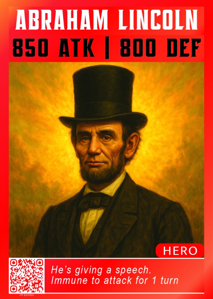 About: The only US President to appear in Faction Clash, and we're lucky he did. One turn of immunity can set you up for many different strategies. His respectable ATK and DEF values make this card a great play in all game phases, though his defense is just low enough to be sniped by cards like "Hitman". Do not fear, Honest Abe is here.